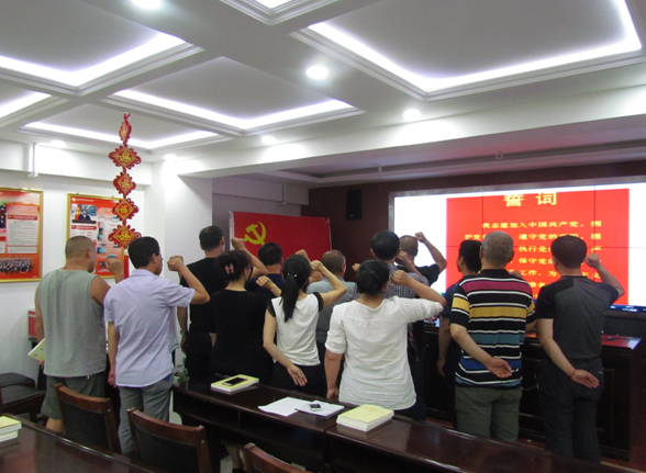 學習結束后,全體黨員面對黨旗,由黨總支書記謝利民領誓重溫入黨誓詞。