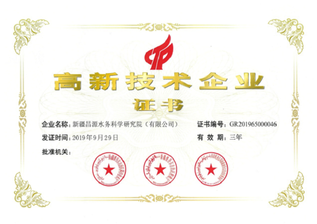 2019年9月29日,新疆昌源水務(wù)科學(xué)研究院順利通過高新技術(shù)企業(yè)認(rèn)定(2019年12月19日取得證書),獲得自治區(qū)科技廳、財(cái)政廳和稅務(wù)局聯(lián)合頒發(fā)的“高新技術(shù)企業(yè)證書”。